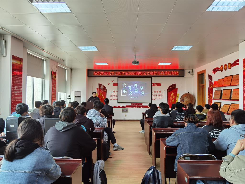宫瑞竹是我校2004级化工优创专业校友,现任巨化集团浙江晋巨化工有限公司人力资源部副部长。他先以一首打油诗作为开场白“化院毕业初入行,意气风发斗志昂。工艺营销和人力,酸甜苦辣心中藏。”宫瑞竹说道,自从毕业以来,虽然每天都是忙碌奔波,也想过退缩放弃,但他相信付出终有回报,方向没错终会成功。正是由于自己的努力和赶上的机遇,毛遂自荐,敢于发声,才会让自己实现梦想,最终变大变强。他结合自身的学习、就业经历以及公司的招聘标准,鼓励同学们准备要趁早、学习要专一、态度要诚恳,强调学好专业课的重要性,并寄予同学们在今后学习或者工作的道路上,要学会复杂寻找简单。
